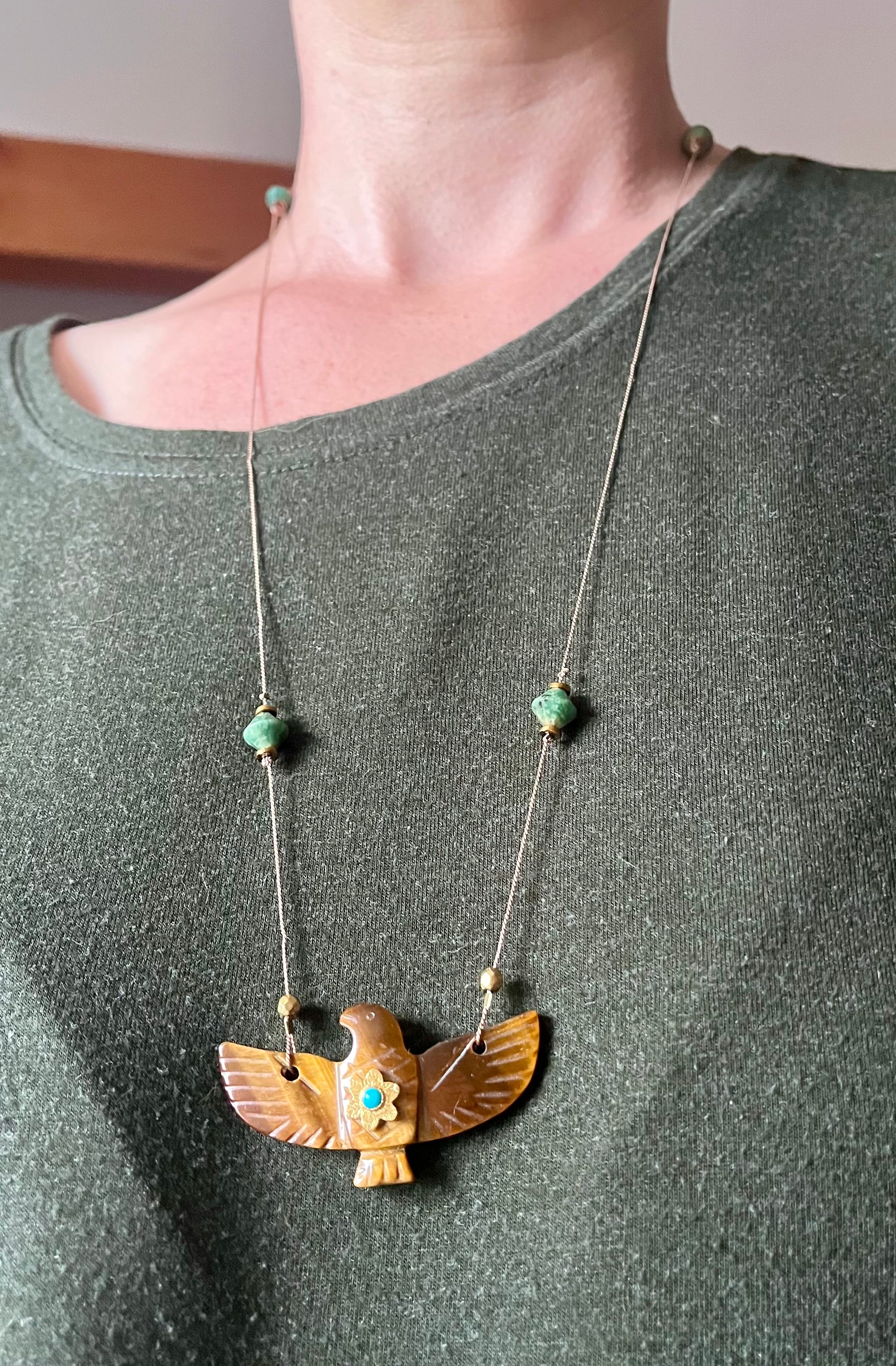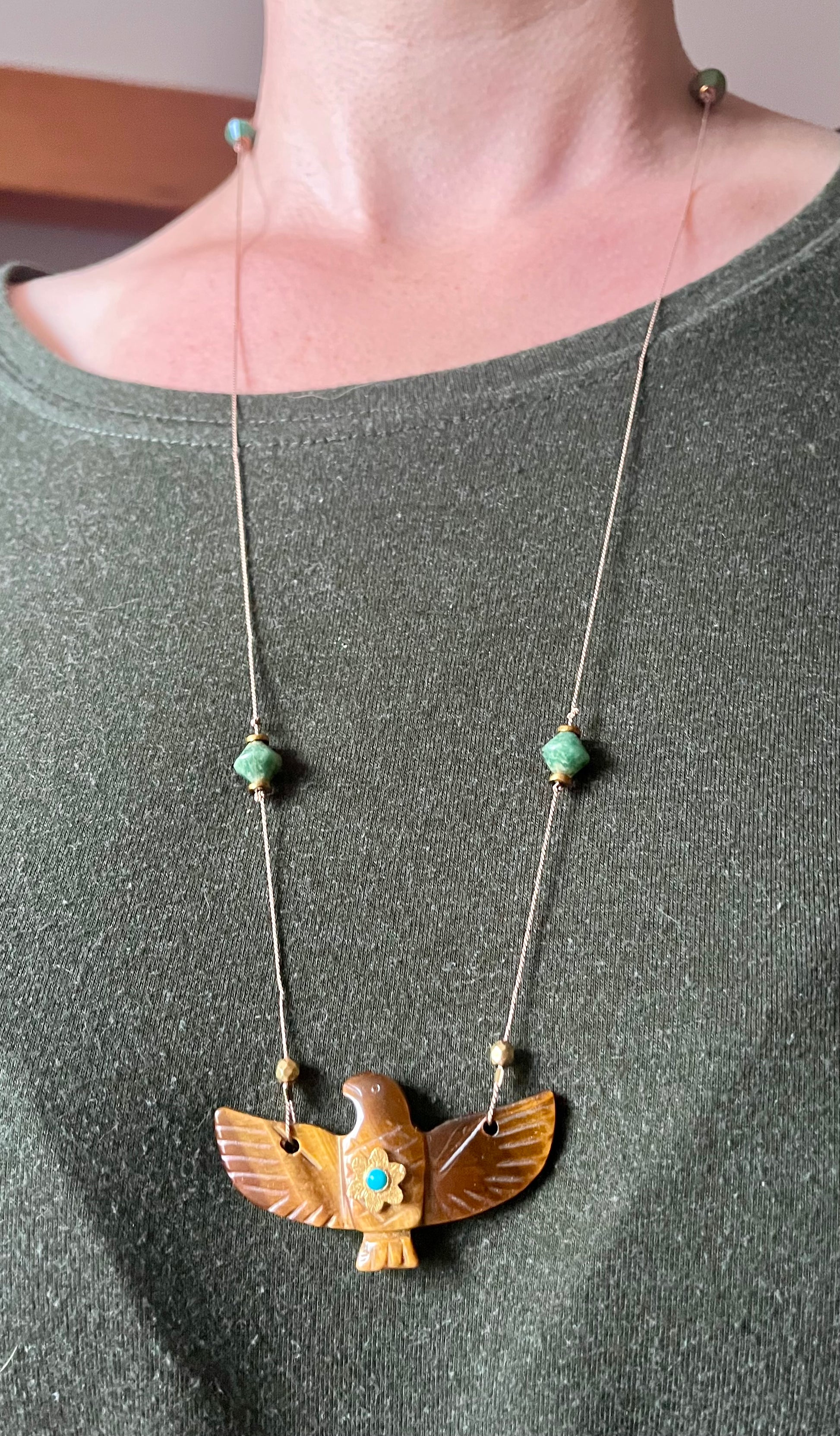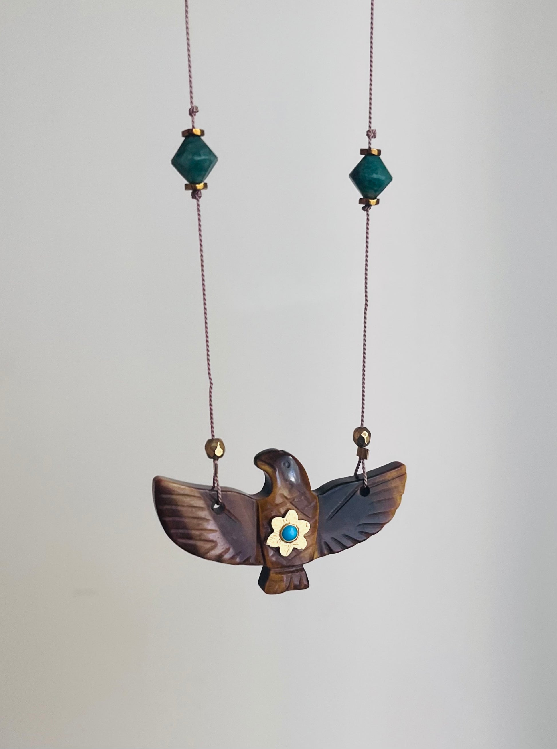 Pendentif phœnix Oeil de Tigre serti d’une petite Turquoise.