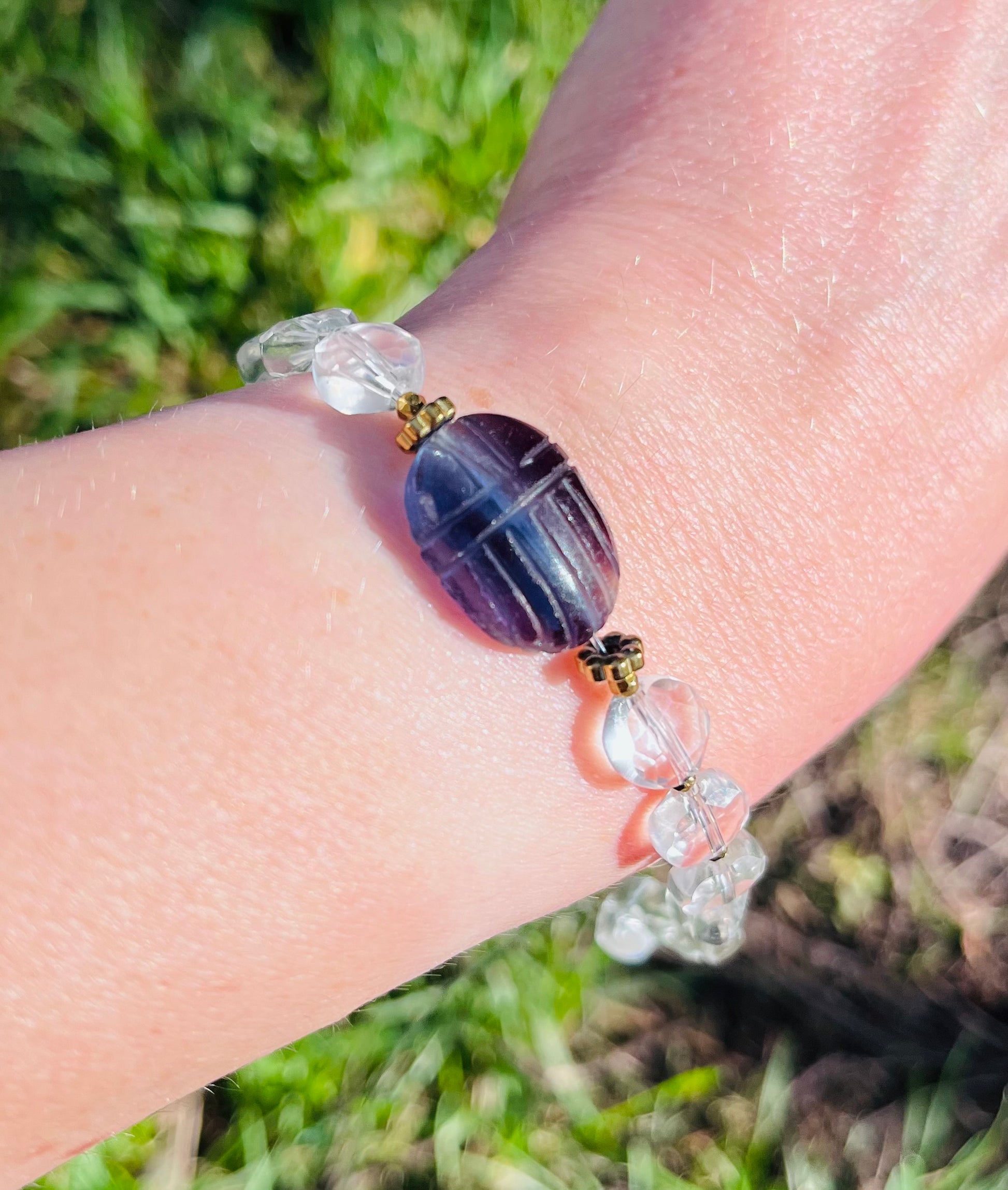 Bracelet amulette scarabée Fluorite et Cristal de Roche