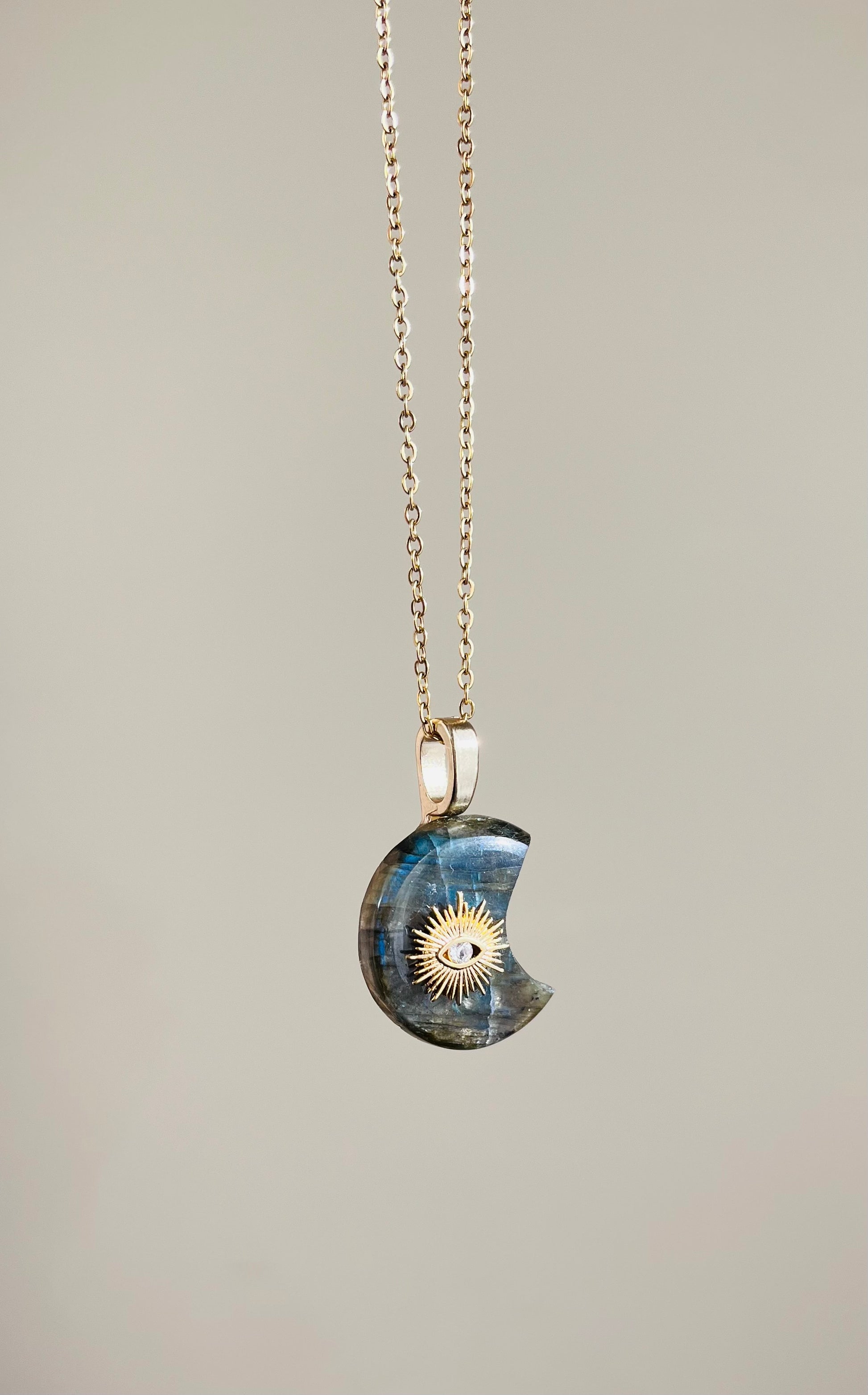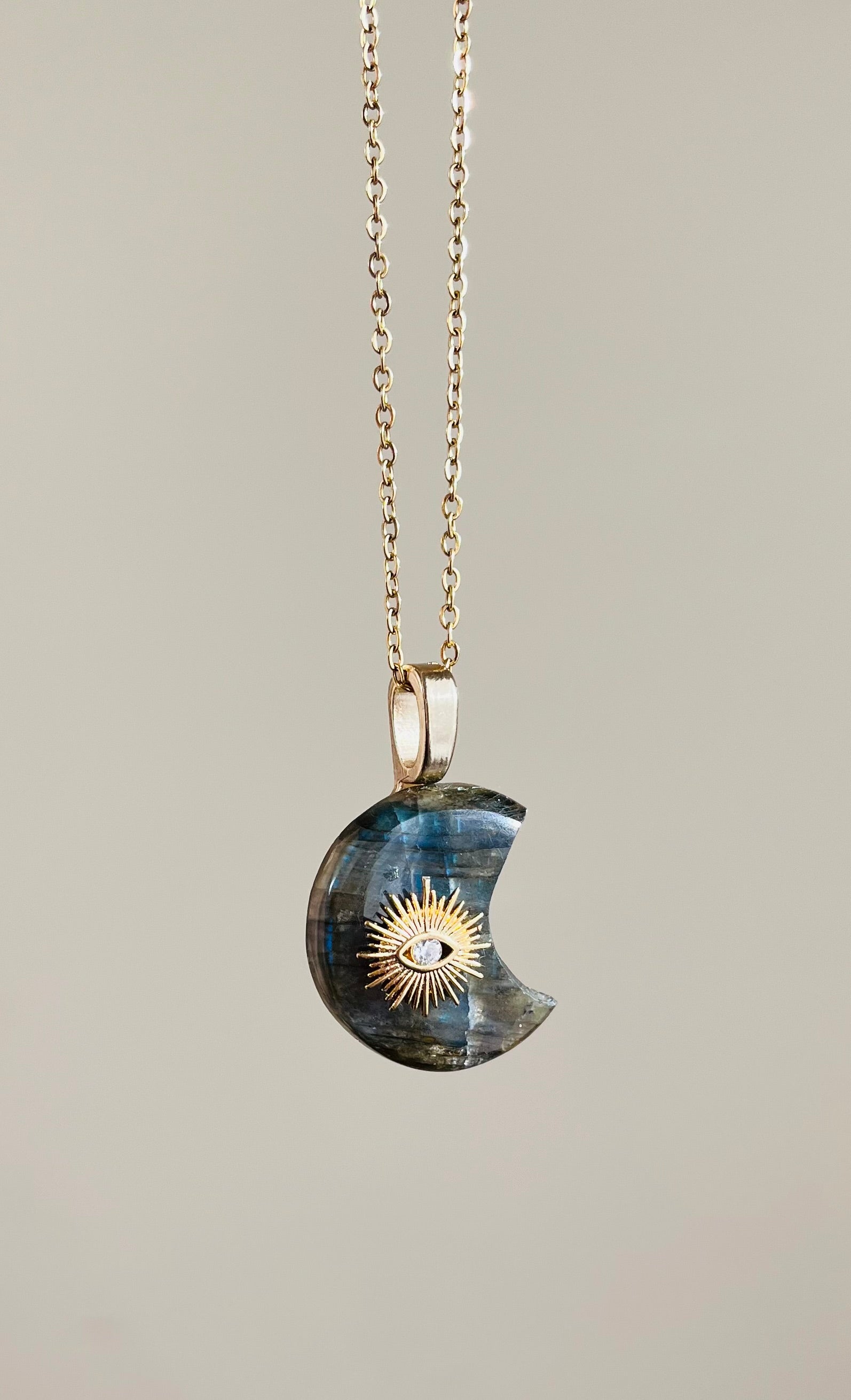 Pendentif lune en Labradorite serti d’un œil protecteur.