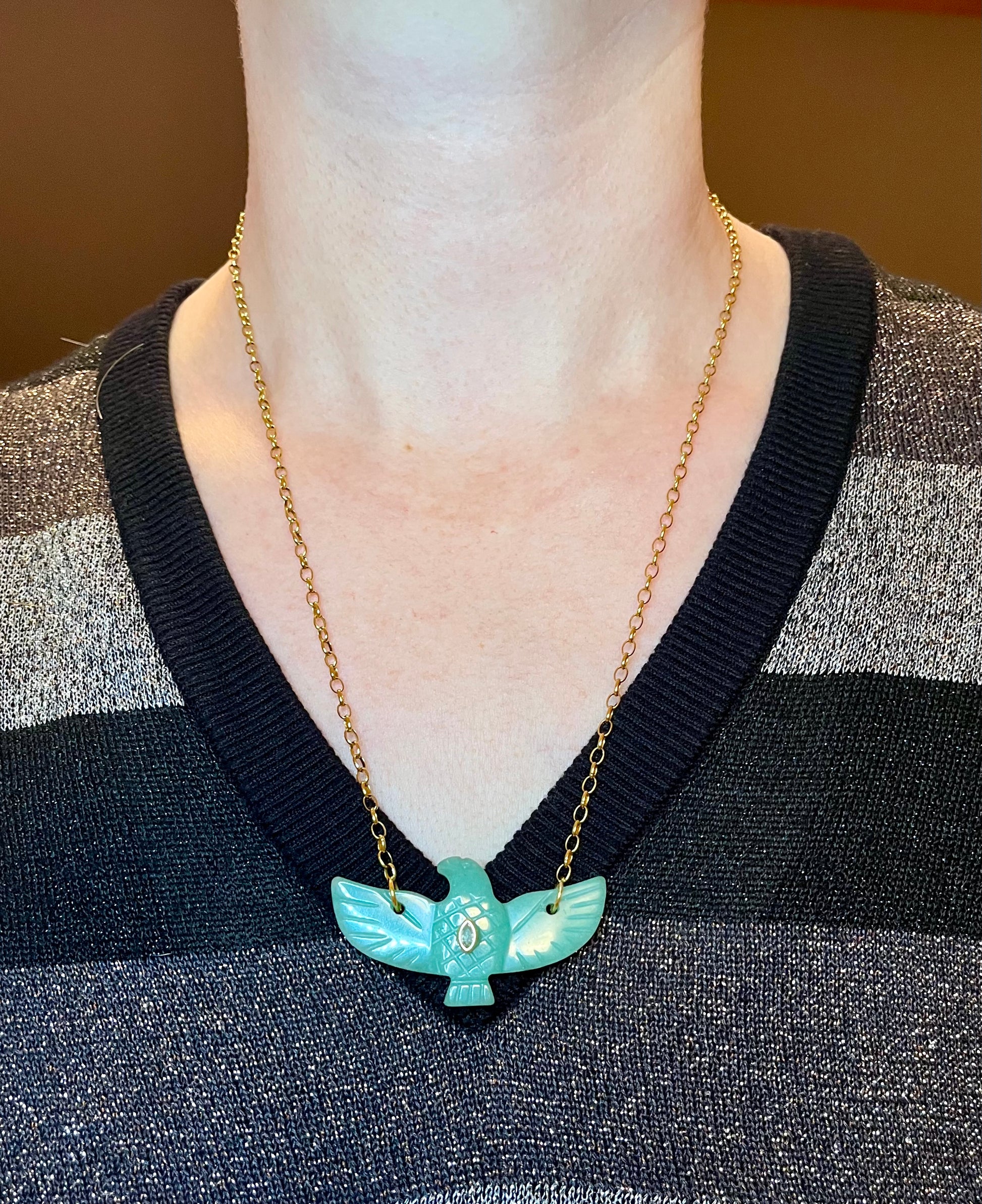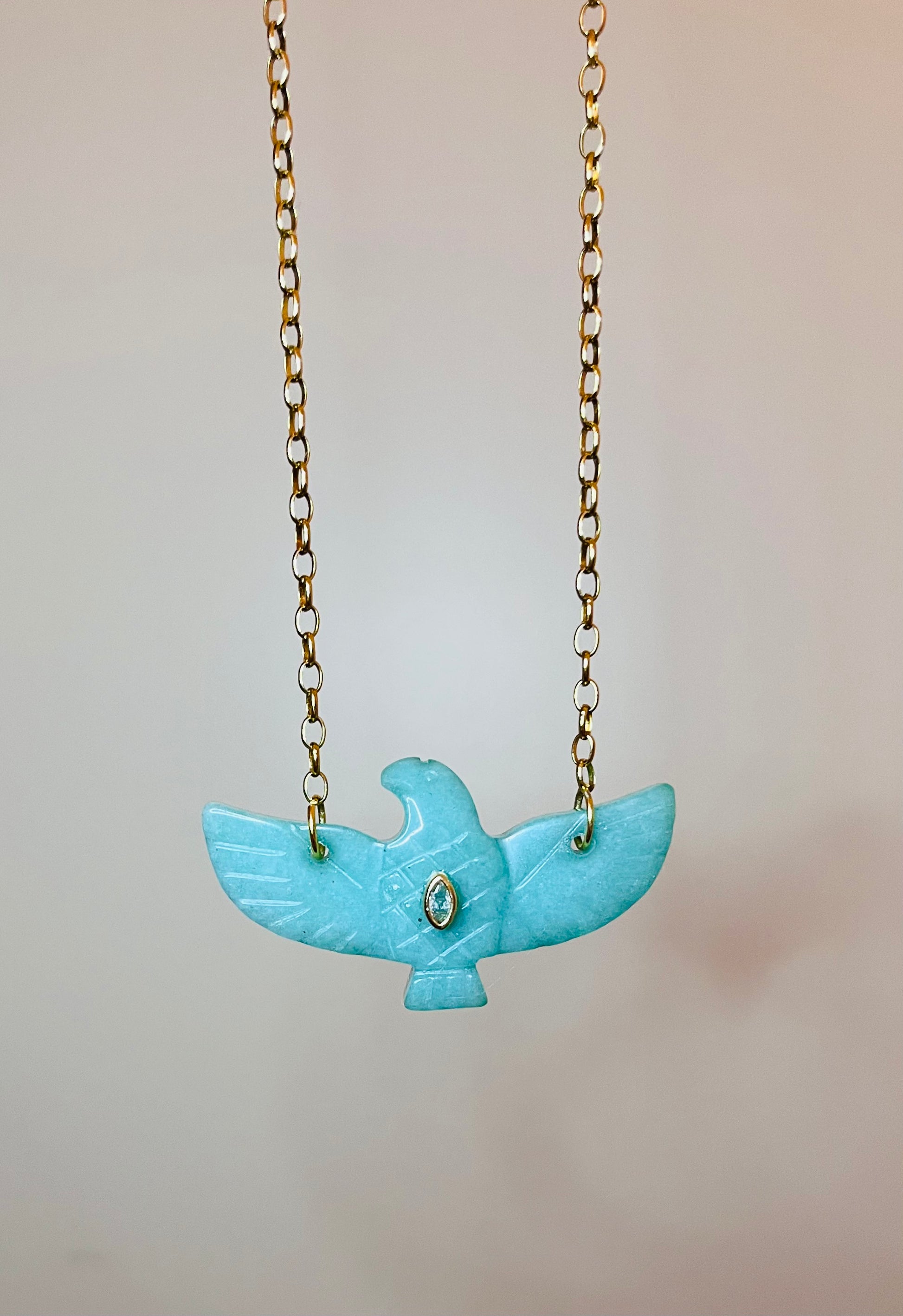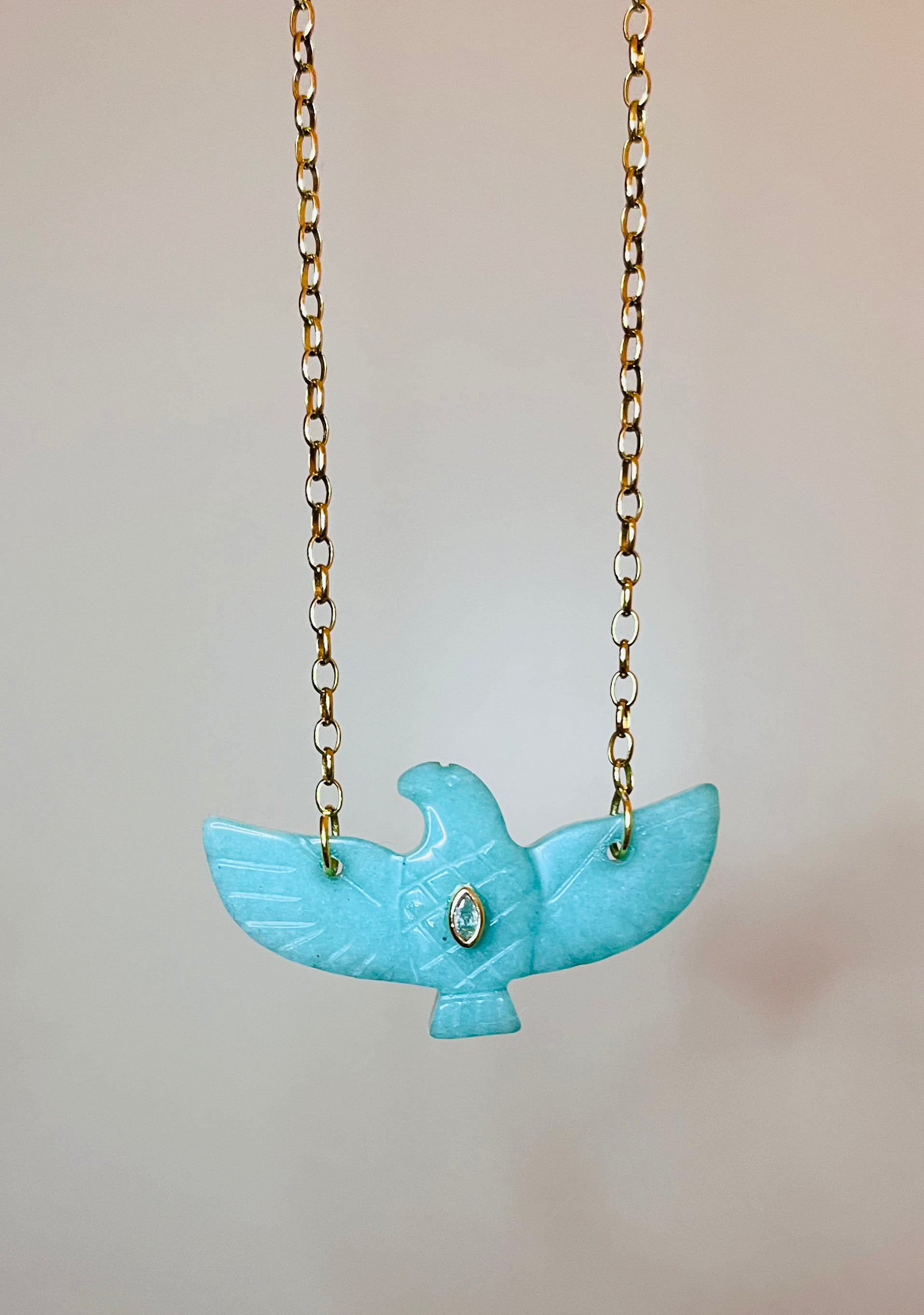 Sautoir chaîne maillons ronds dorés à l’or fin et pendentif aigle en Amazonite serti d’un oxyde de zirconium.