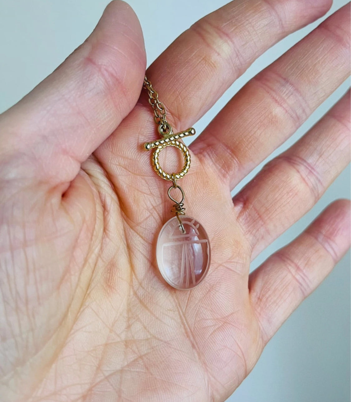 Ce collier scarabée en cristal de roche est un bijou chargé de sens, inspiré des symboles ancestraux de protection, de renaissance et de lumière. Entièrement fait main, il associe l’élégance d’une chaîne dorée à la finesse d’un pendentif scarabée gravé dans un cristal de roche naturel.
