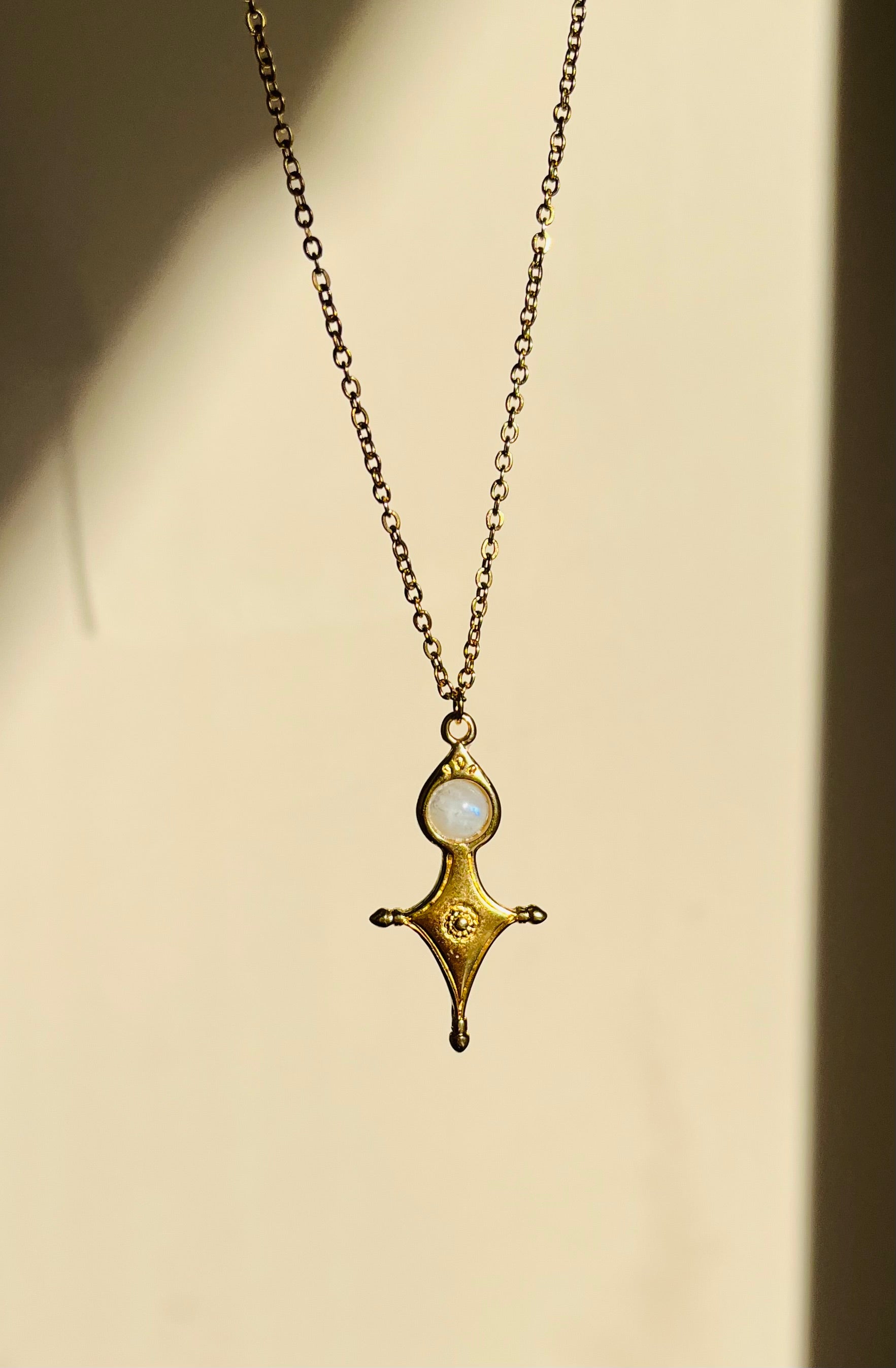 Pendentif grigri croix du Sud ornée d'une Pierre de Lune.