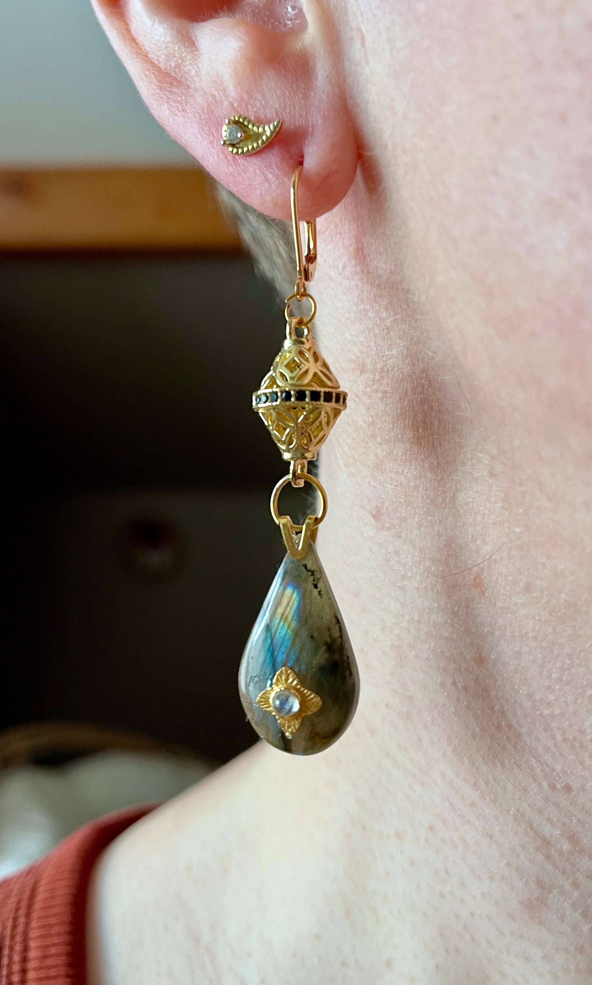Goutte Labradorite sertie d’une petite Pierre de Lune.