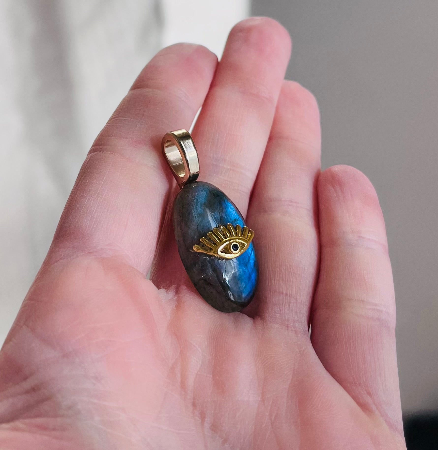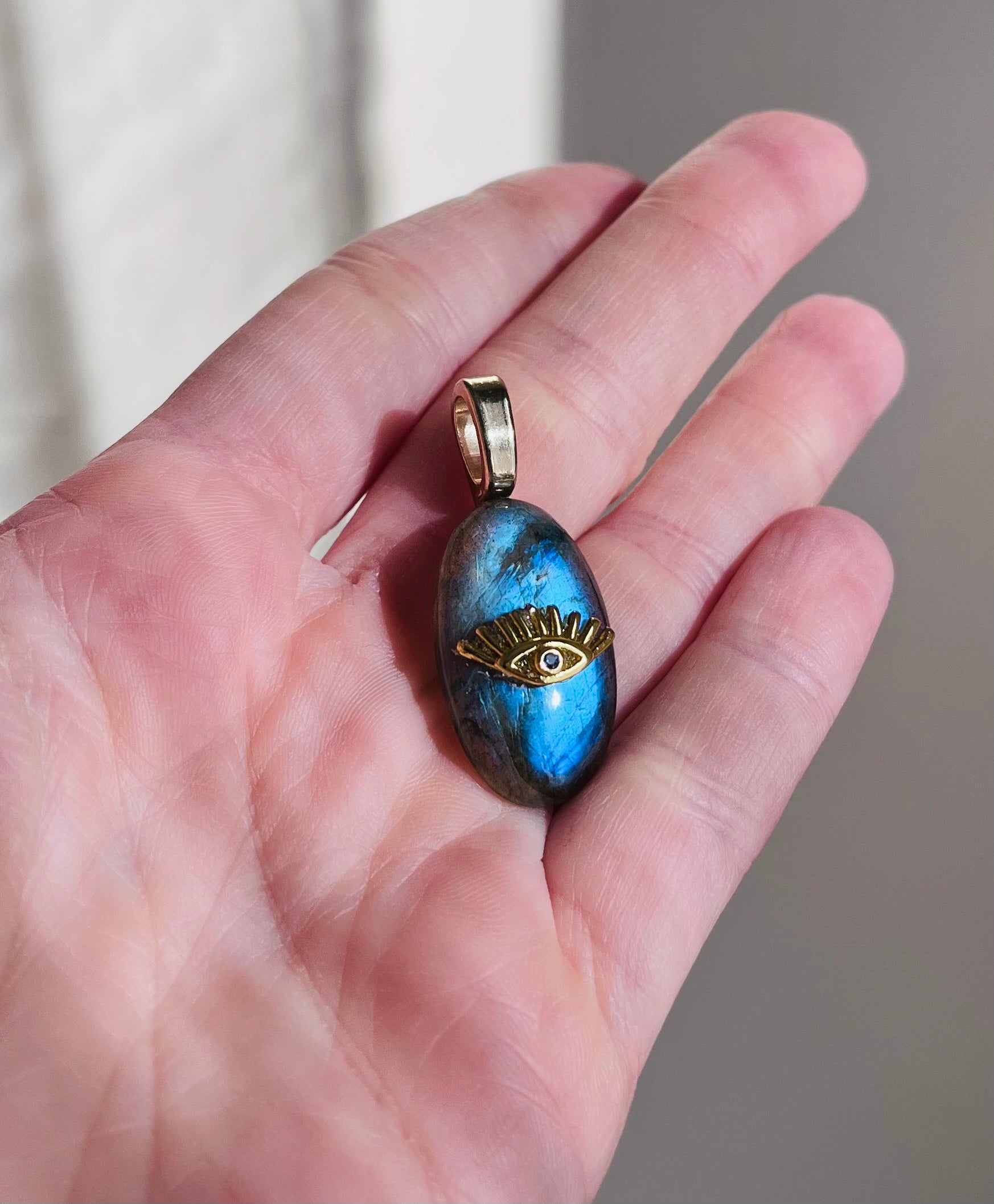 Pendentif talisman Labradorite sertie d’un œil protecteur.