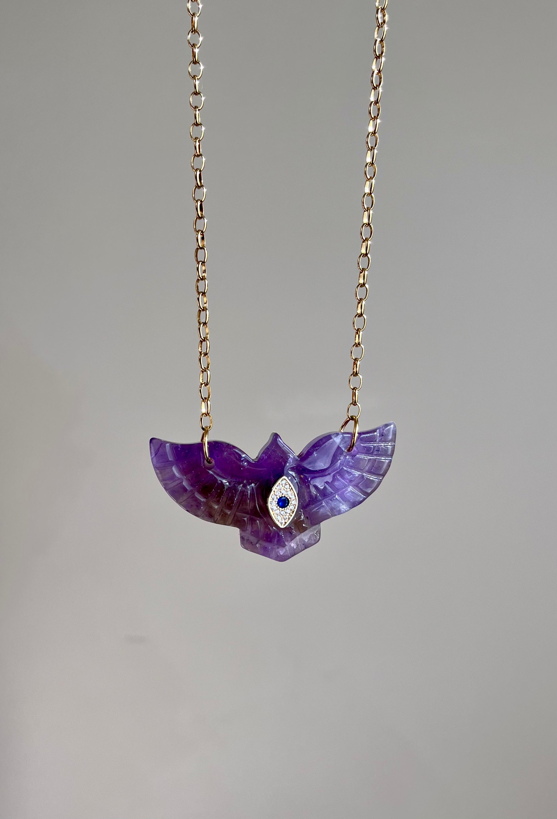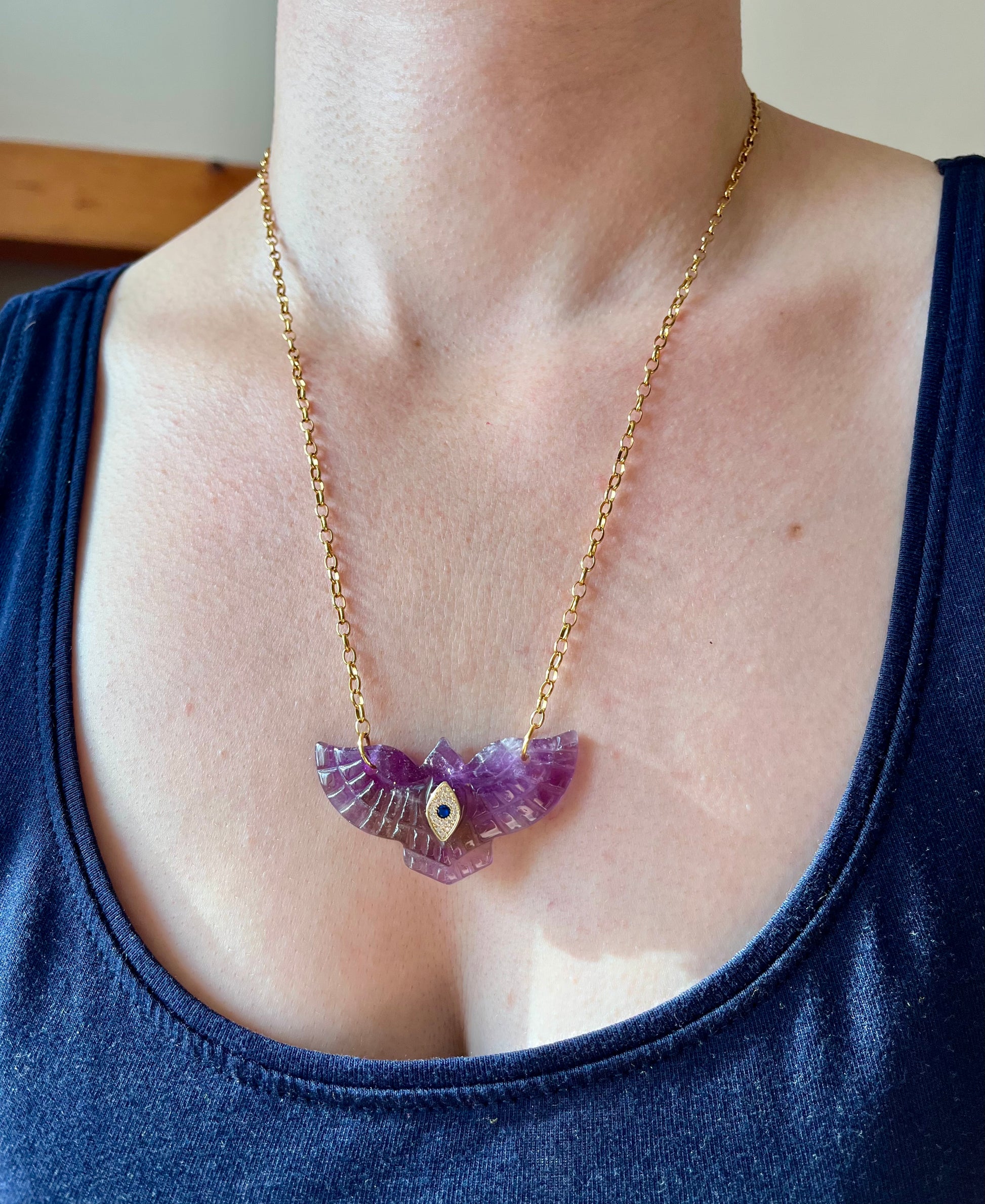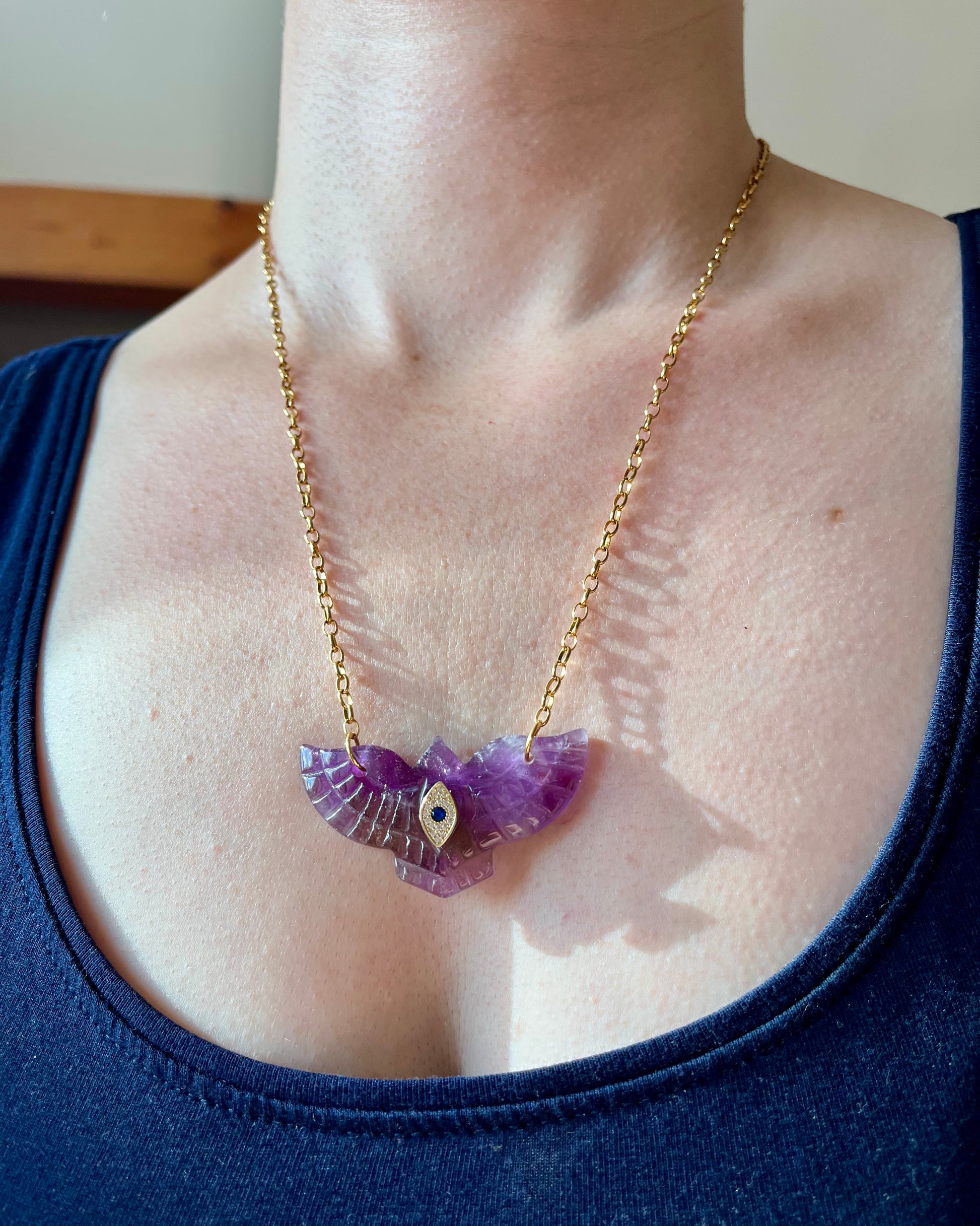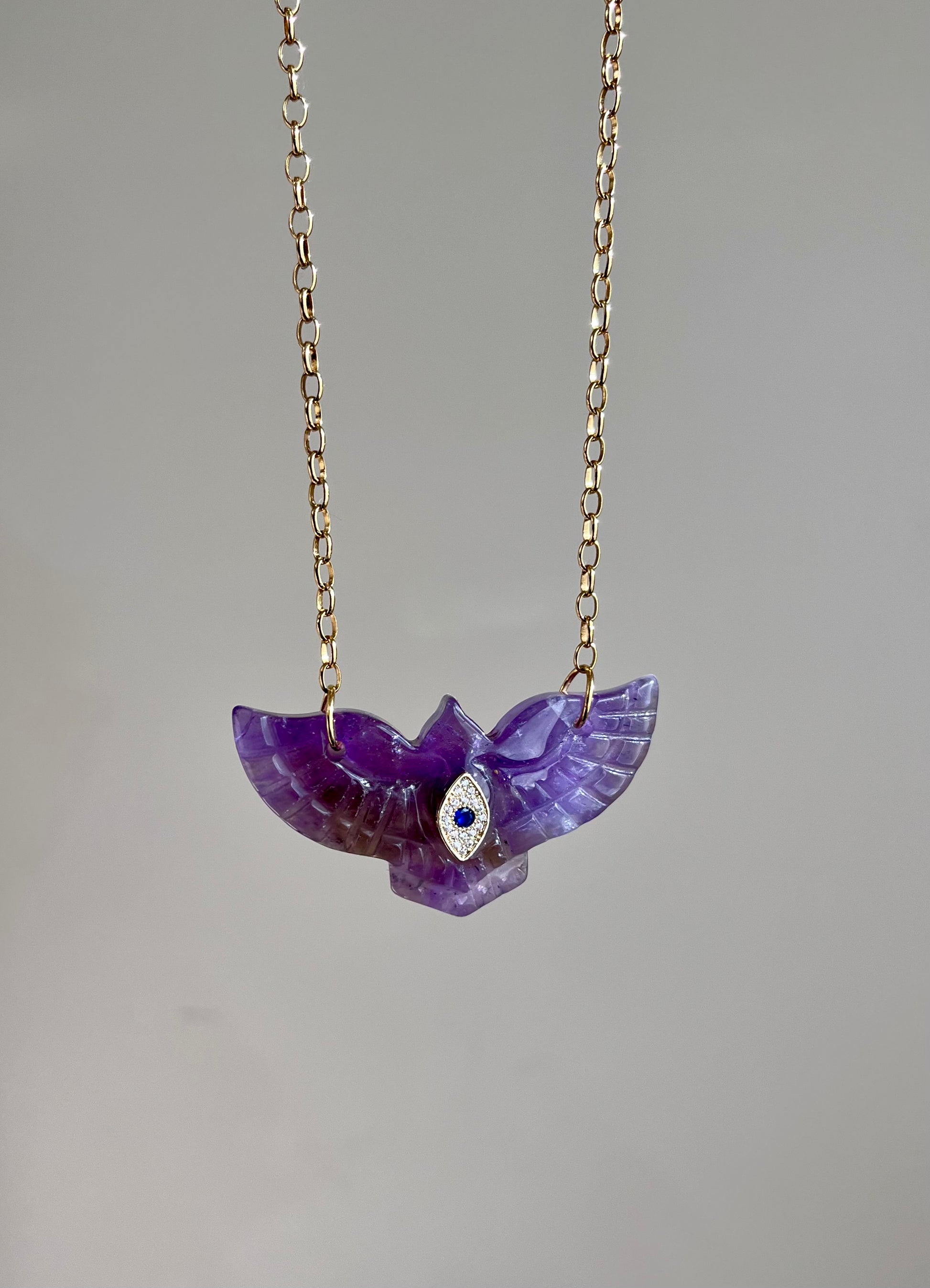Sautoir chaîne maillons ronds, acier inoxydable doré à l’or fin et amulette aigle en Améthyste.
