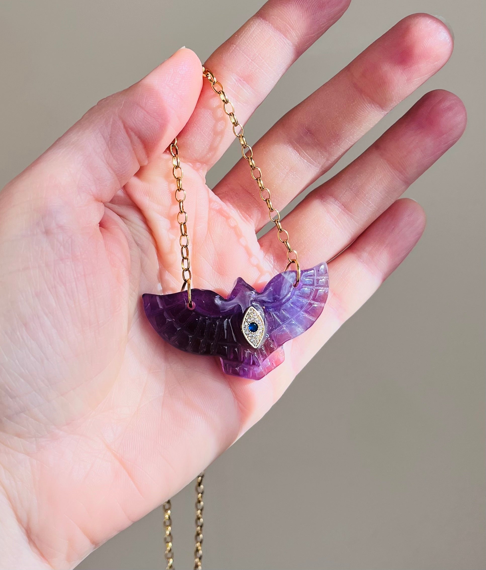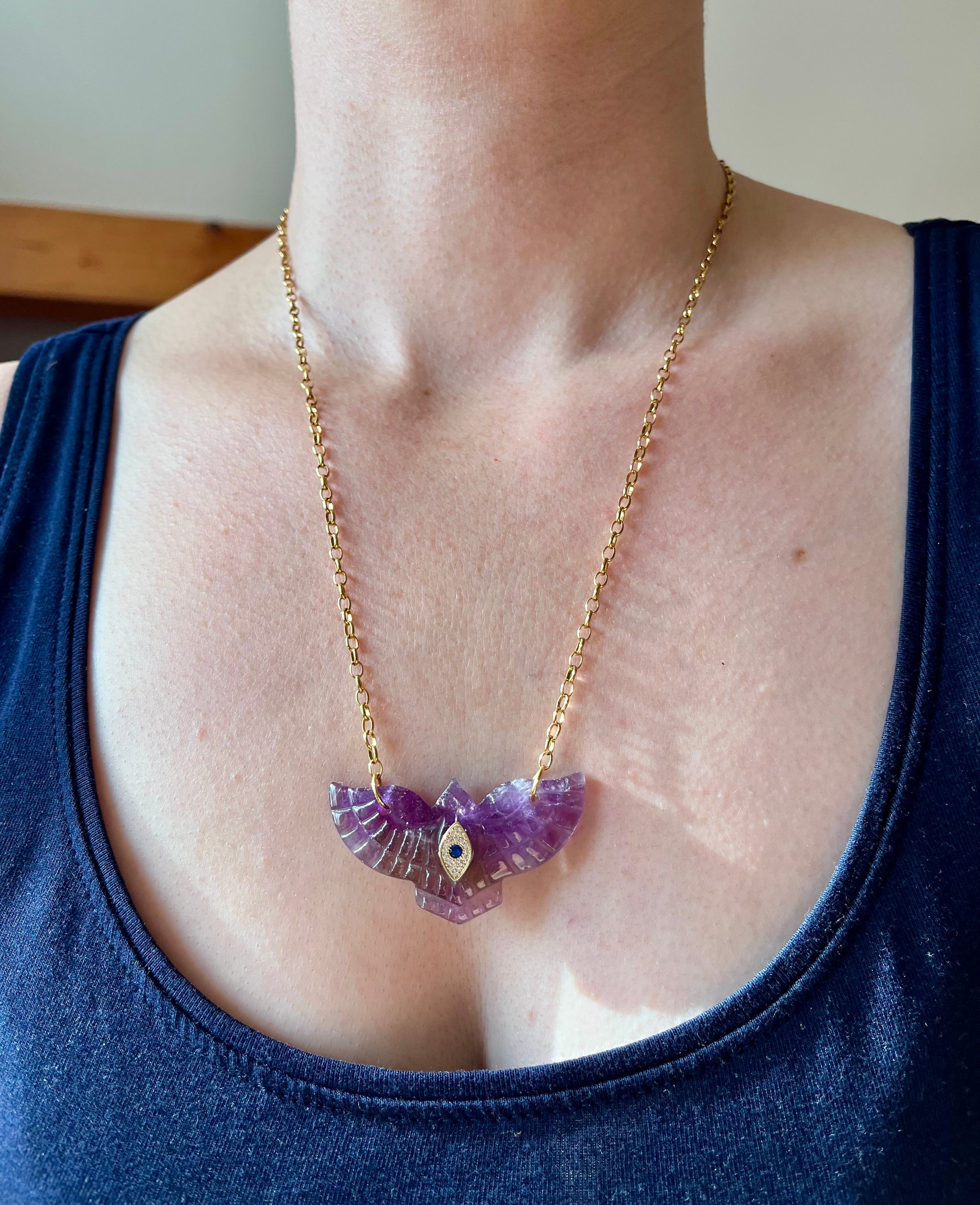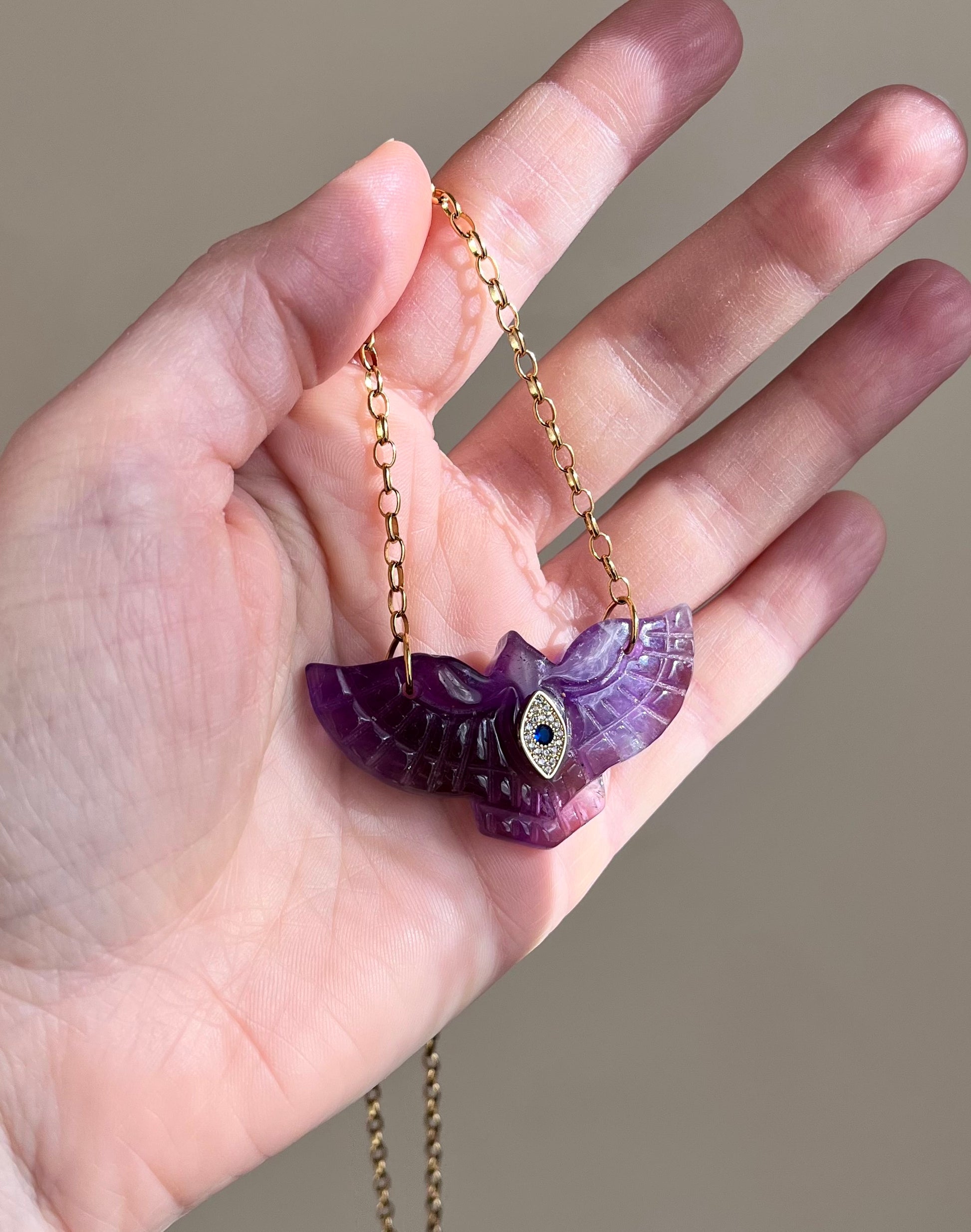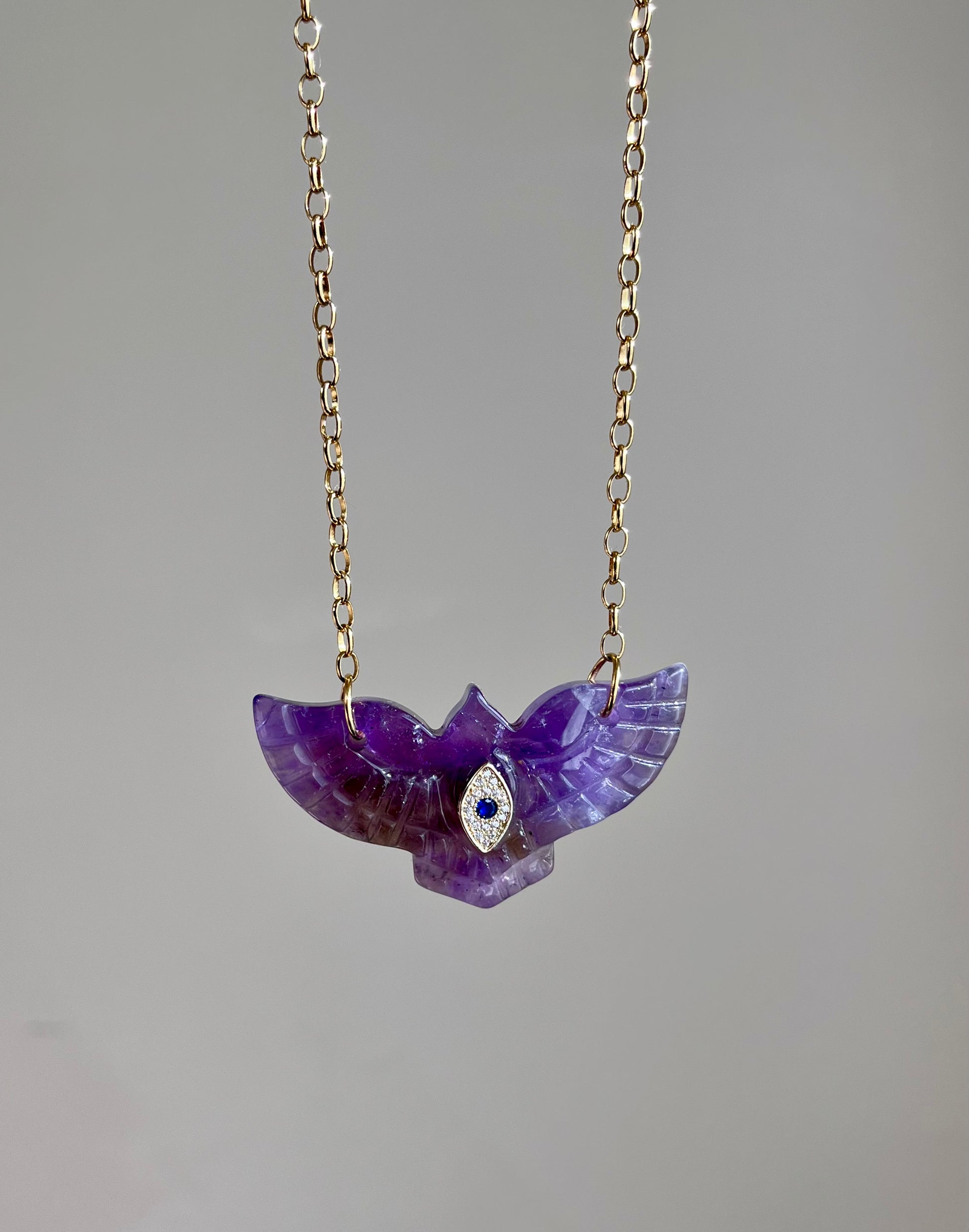 Sautoir chaîne maillons ronds, acier inoxydable doré à l’or fin et amulette aigle en Améthyste.