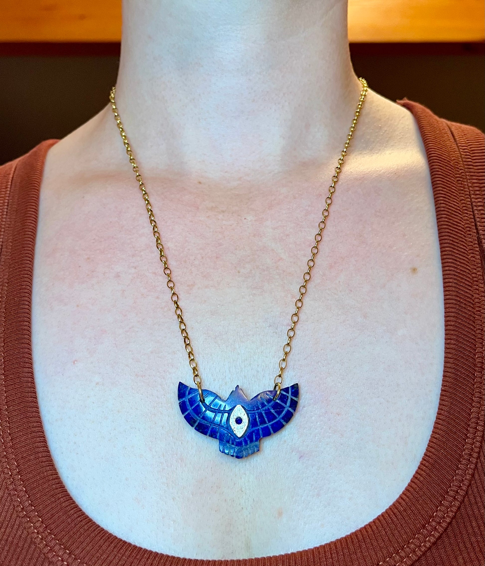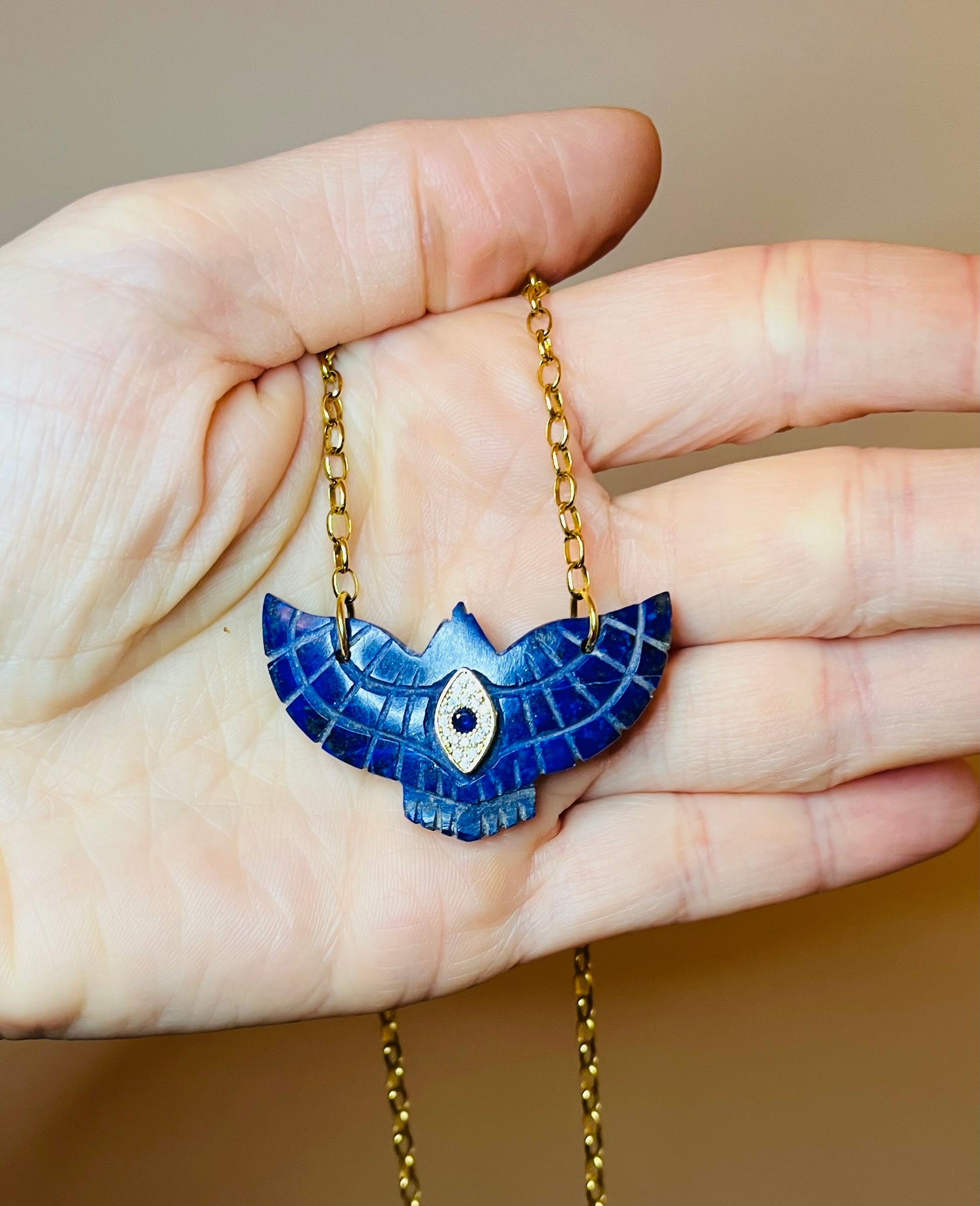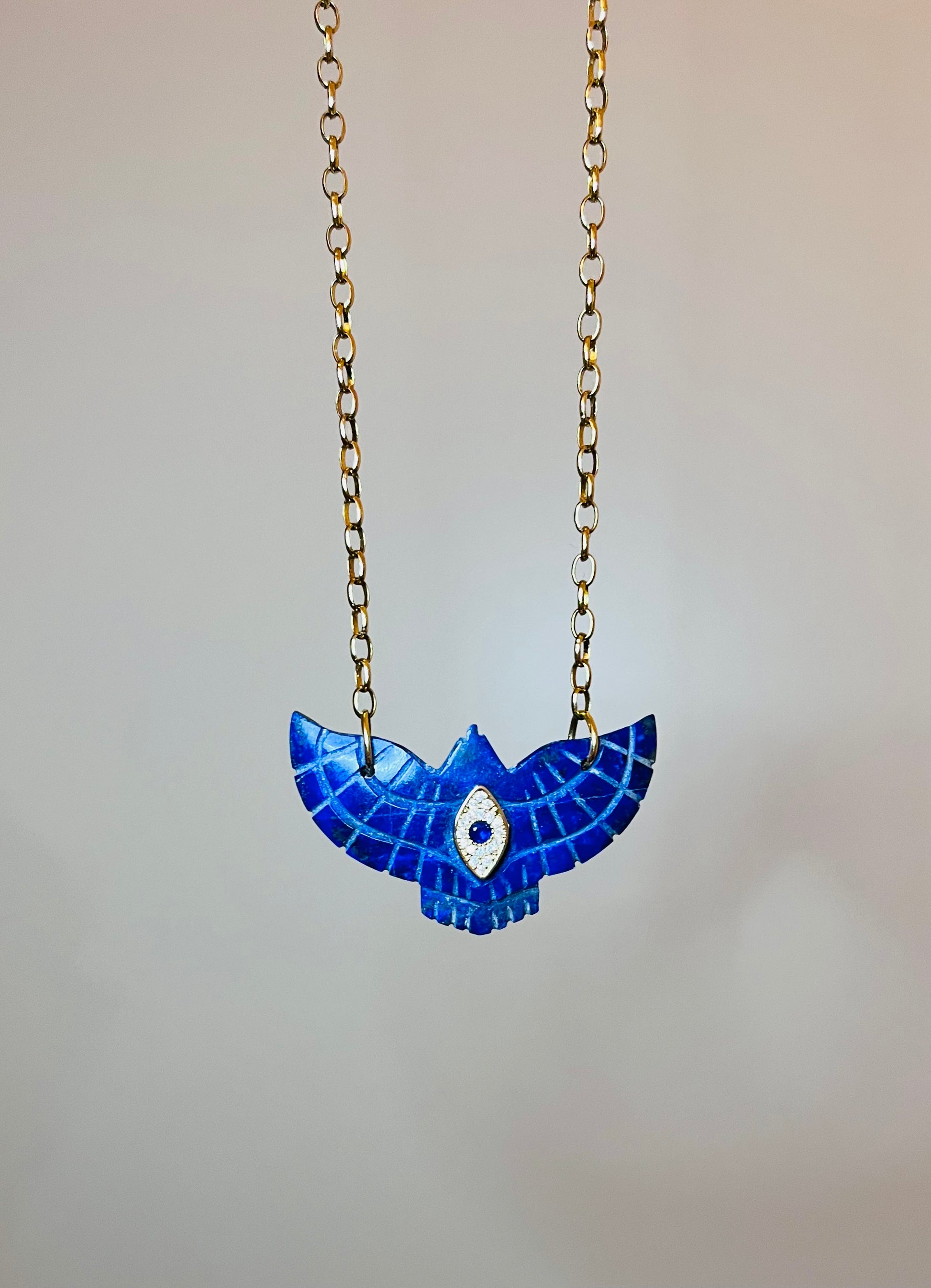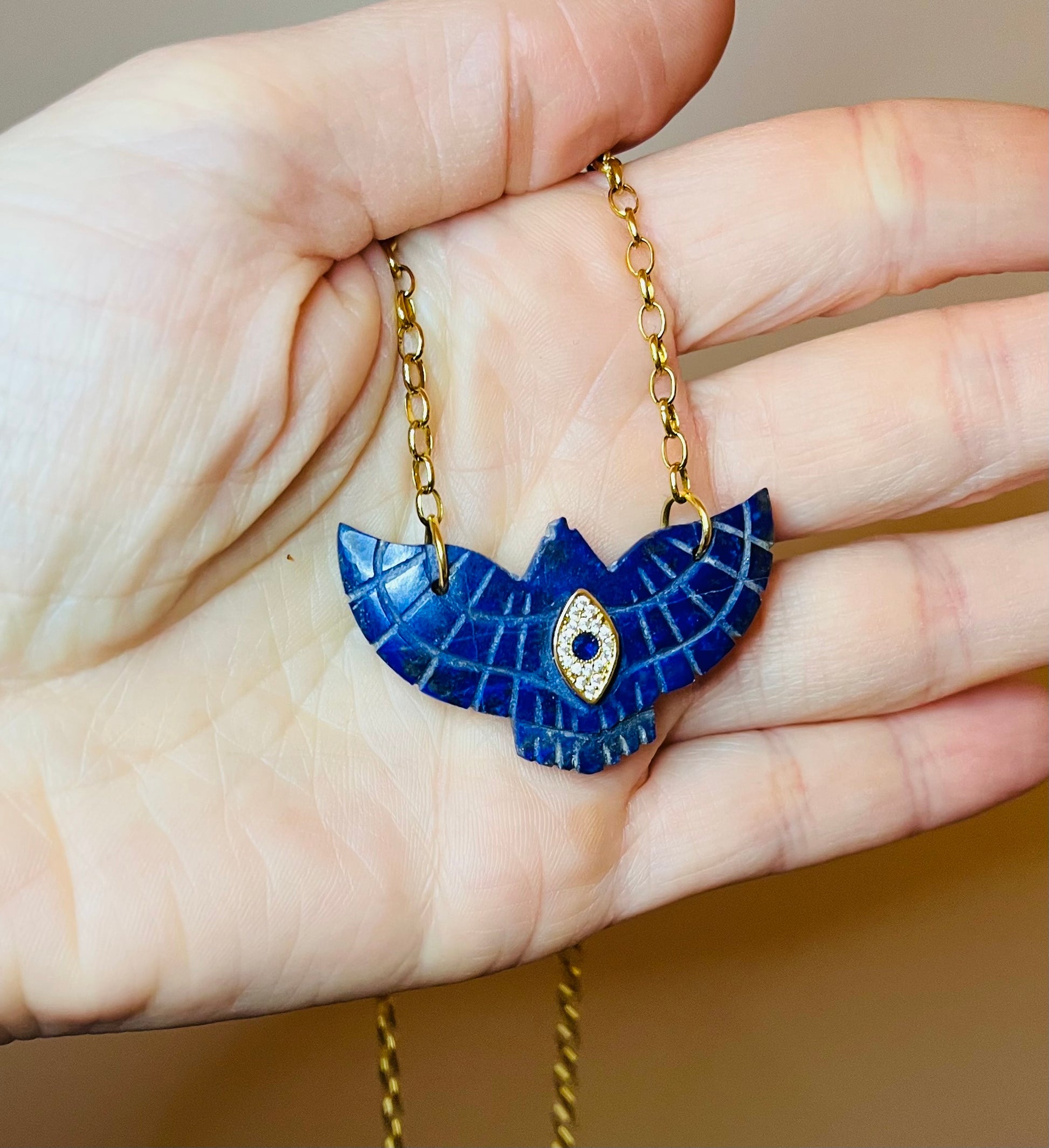 Sautoir chaîne maillons ronds dorés à l’or fin et pendentif aigle en Lapis-lazuli serti d’oxydes de zirconium.